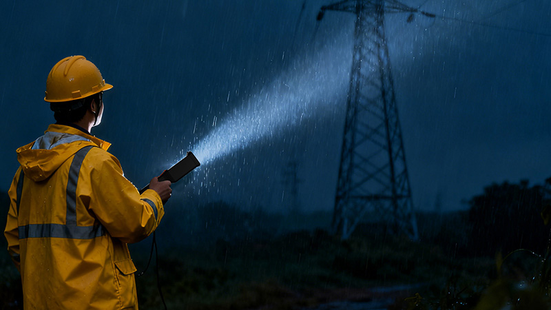 电力人员冒雨持手电照杆塔,光束穿透雨幕