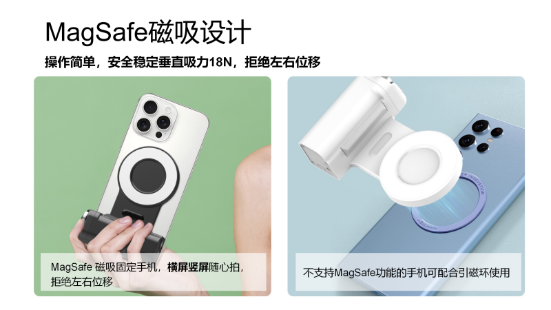 这款助拍手柄采用MagSafe磁吸设计,拥有垂直吸力18N的强劲磁力,彻底告别左右位移的尴尬。无论是横屏拍摄风景,还是竖屏录制vlog,手机都能牢牢固定,让你专注于创作本身。