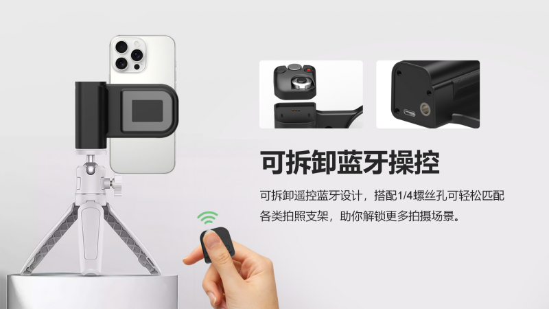 这款助拍手柄的可拆卸蓝牙遥控器搭配1/4螺丝孔,可以轻松匹配各类拍照支架,无论是自拍、直播还是专业拍摄,都能完美适配。想象一下,在旅行中拍摄延时摄影,或者在家中直播带货,它都能成为你的得力助手。